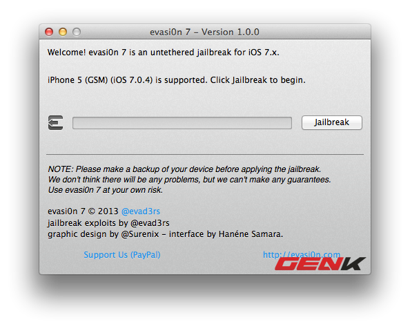 Bước 1: Công cụ jailbreak của evasi0n luôn rất đơn giản, sau khi tải về công cụ, bạn nháy đúp để mở evasi0n.Bước 2: Kết nối iPhone, iPad với máy tính bằng cable USB, khi evasi0n nhận thông tin máy, click nút "Jailbreak" để evasi0n thực hiện quá trình.